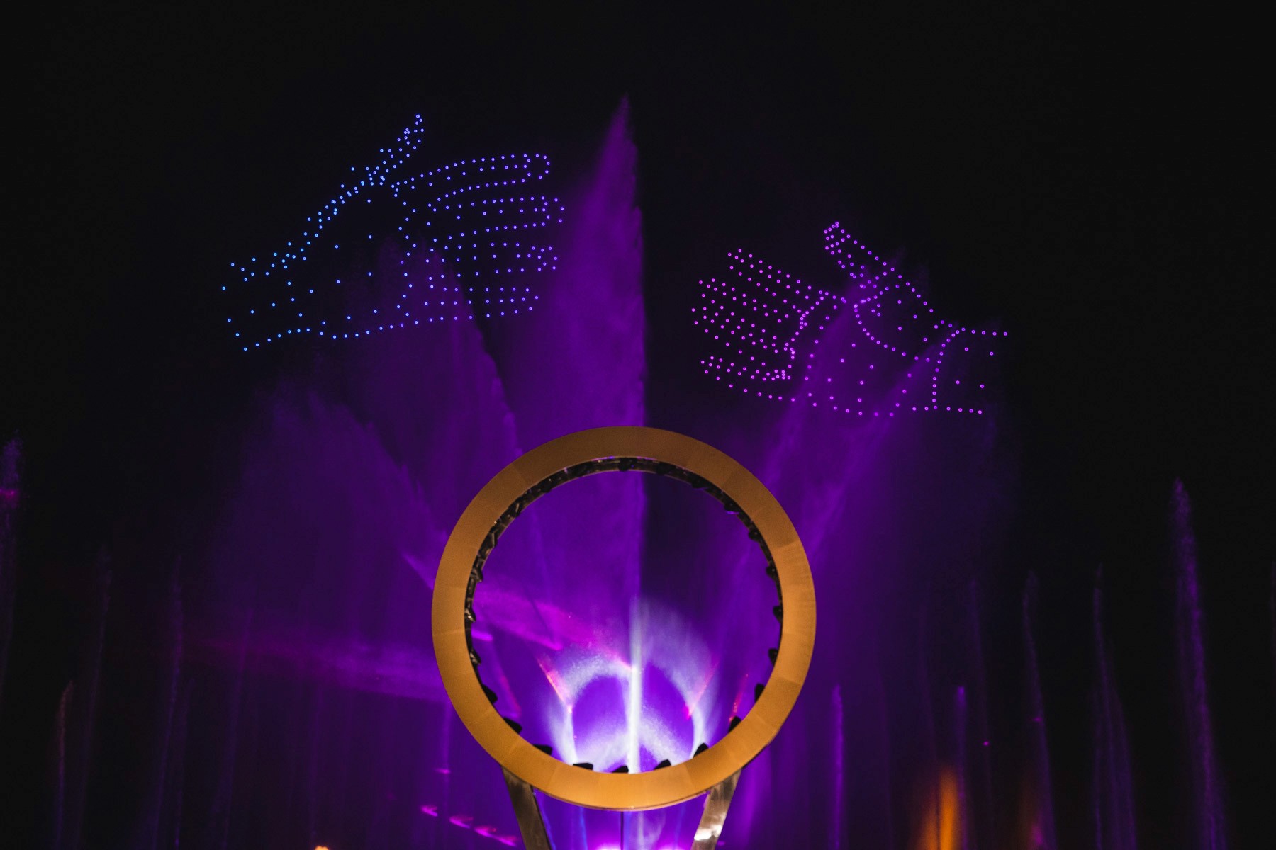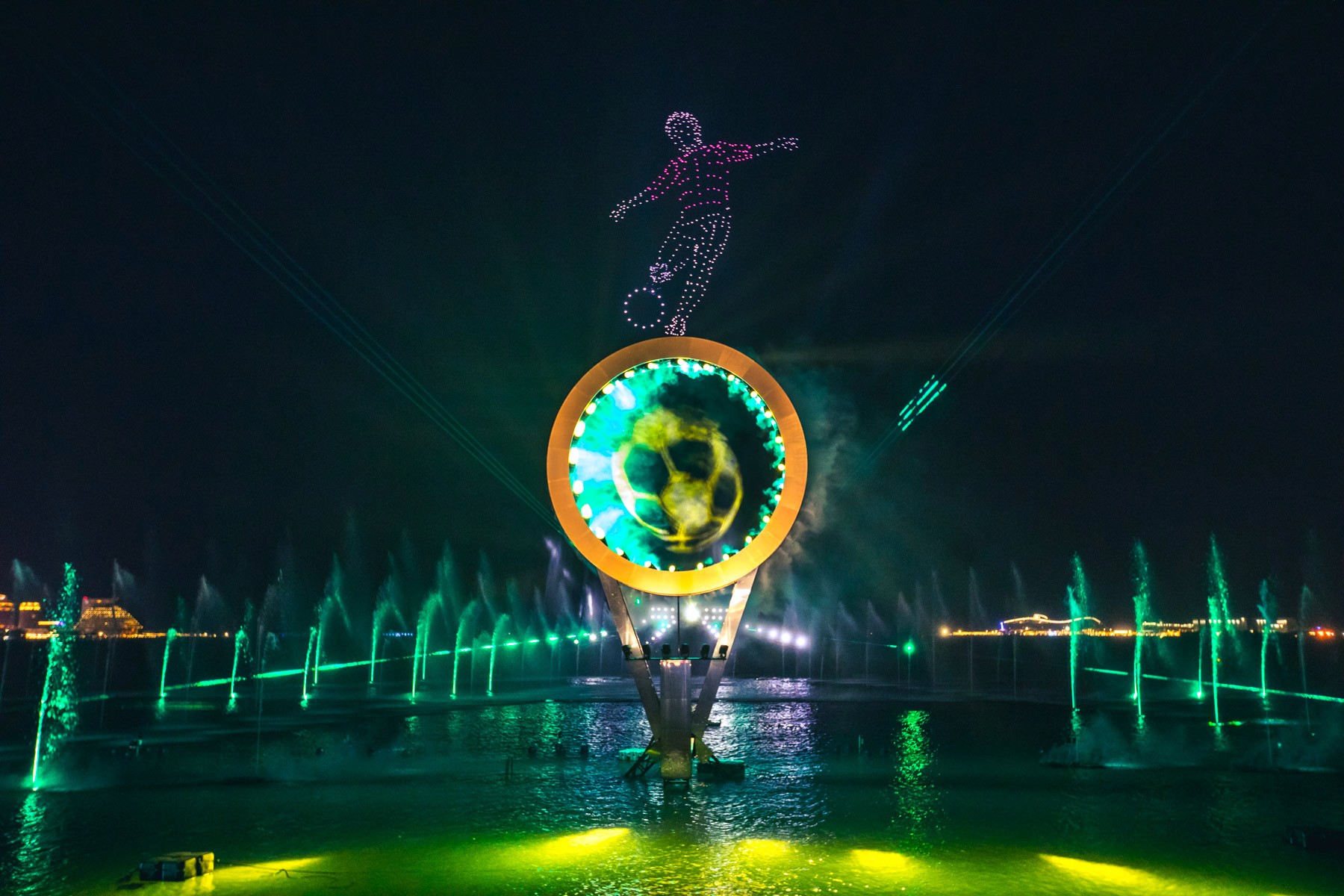 A floating one-hectare stage combined water fountains, 3D projections, acrobatic performances, pyrotechnics, and a 500-drone choreography into a powerful message of unity through football.